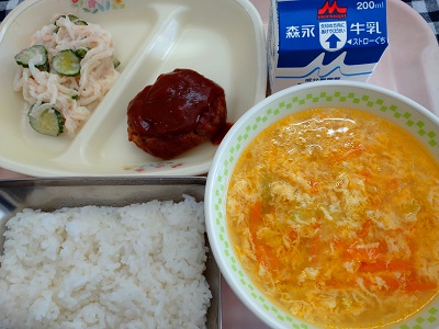 今日の給食は、ごはん、ハンバーグデミグラスソース、だいこんサラダ、たまごスープ です。(中学校:かぼちゃ蒸しケーキ) です。