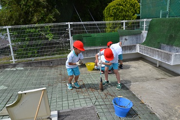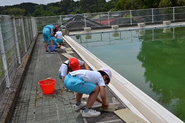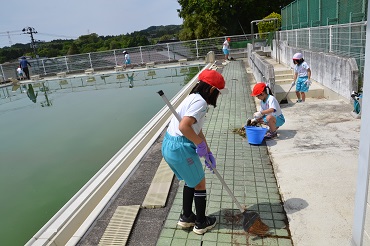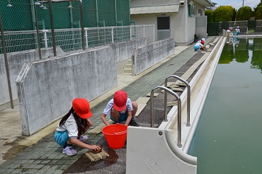 1・2年生と3・4年生が別々の時間にプール清掃を行いました。