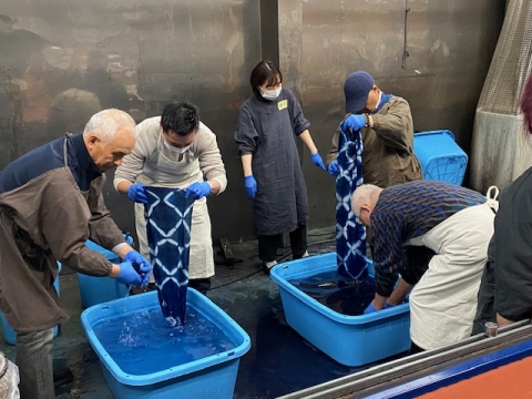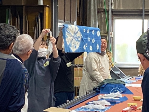 絞りの仕方をレクチャーいただき、藍に入れると最初緑色だった布が空気に触れ少しずつ青に変わる様子も・・・。思い描いた図柄とはいかなかったかもしれませんが、皆さんなかなかの作品ができあがりました。バスの中での研修も含め、秋を満喫した一日でした。