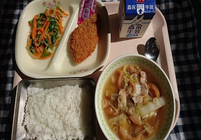 今日の給食は、ごはん、かつおフライ(ソース)、だいこんのナムル、油麩汁 です。