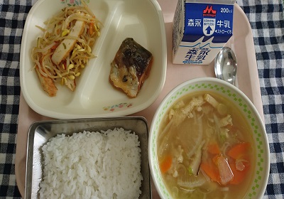 今日の給食は、ごはん、さばのみそ煮、豆もやしとさつま揚げの炒め煮、すいとん汁 です。