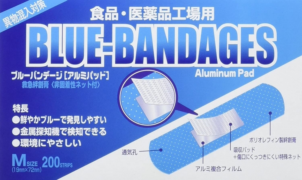 「水色」「ピンク」の救急絆創膏は、主に食品・医薬品工場用に異物混入用対策として開発されたもので、