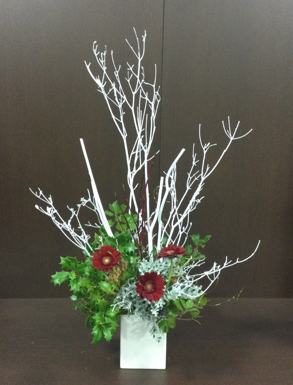 白、赤(ガーベラ)、緑(ヒイラギ)の絶妙なバランス