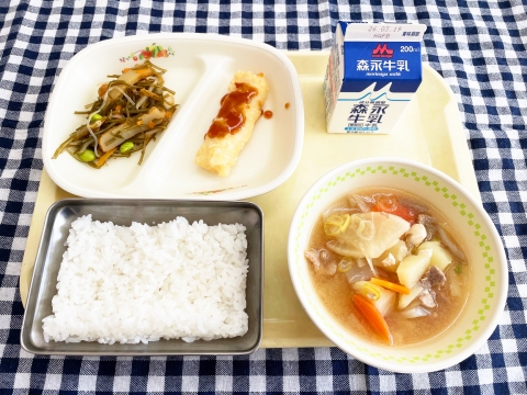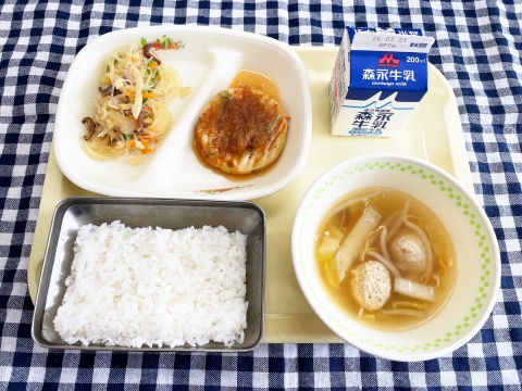 今日の給食は、明日幼稚園を卒園する年長組のみなさん、来週小学校を卒業する6年生のみなさんへ、お祝いの気持ちを込めた献立です。
