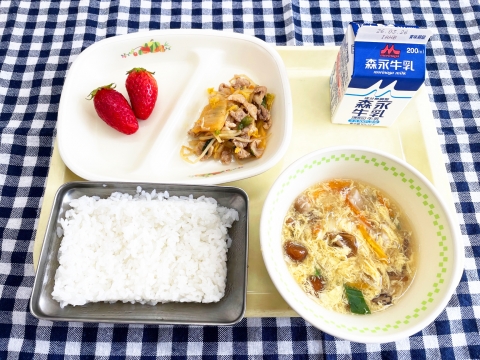 今日の地場産物は、松島産ごはん、松島産はくさい、松島産いちご、豚肉、たまご、牛乳です。