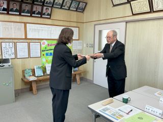 タブレットの使い方についての話を聞いたあとに、校長先生から新しいタブレットを代表の6年生が受け取りました。大事に使って、学習に役立ててほしいと思います。