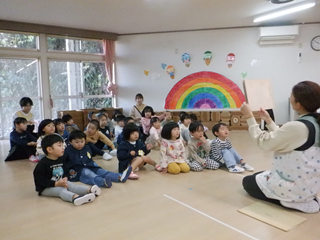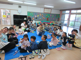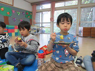 お話あっぷるさんの後、たんぽぽ組・すみれ組さんは給食試食会がありました