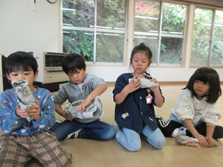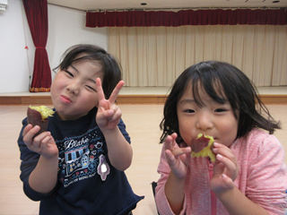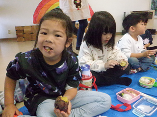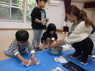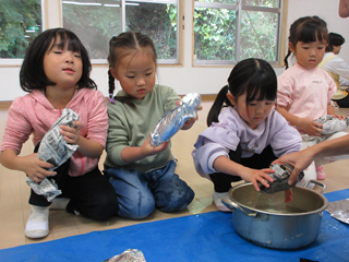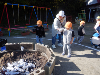 包んださつまいもは園庭で園長先生が焼いてくれました