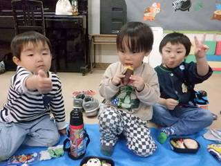 お家の人と一緒に給食をたべることができて、ニコニコなみんな