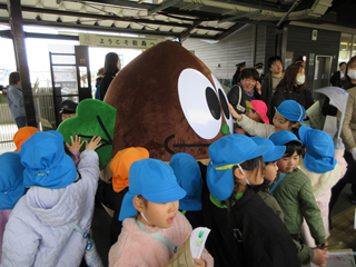 昨日作った旗を振って「どんぐり松ちゃん」と一緒にお客さんのお見送りしました