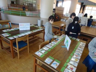 図書館の壁や棚に絵カードが貼ってあります。