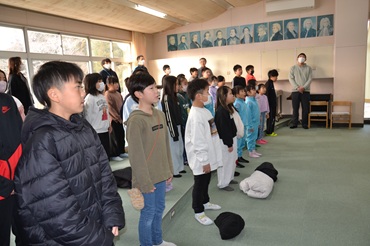 軽く体をほぐした後、全校児童で「学校坂道」を歌いました。