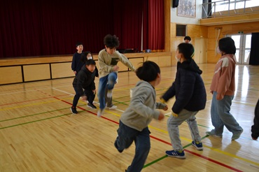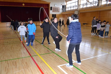 朝の活動の時間に、たてわり大なわとび大会を行いました。