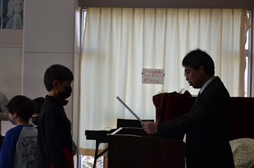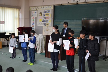 11月8日に行った、たてわり駅伝の表彰を朝の活動の時間に行いました。