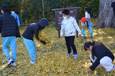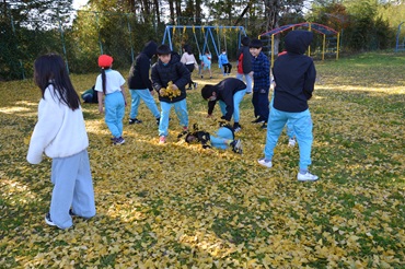 地面にたまったいちょうの落ち葉で、休み時間子供たちが遊んでいます。