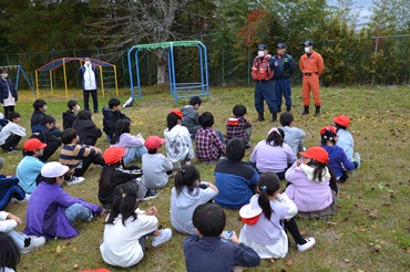 消防署の方々に来ていただき、お話をいただいた後、濃煙体験などをしました。