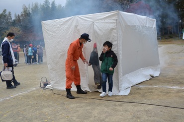 濃煙体験では、テントの中に煙を充満させ、その中を通って煙の様子を体験しました。