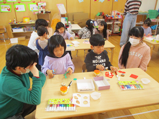 りす・うさぎ組さんは、ランチョンマットや紙コップロケットを作りました