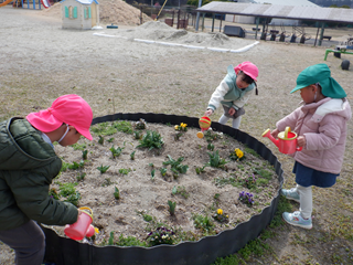 お外では、チューリップの球根にお水をあげていました