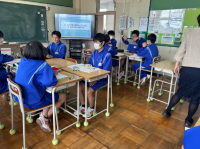 1年生の「家庭」「英語」「保健体育」の授業の様子です。家庭では野菜についてクイズ形式で学習していました。保健体育では、徒競走のゴールについて、胸でゴールできるように繰り返し練習をしていました。英語では、ビンゴで英単語を学ぶ準備として、プリントに一生懸命英単語を記入していました。どのクラスも先生方の話を興味津々な様子で聞き、集中して活動する様子が見られました。