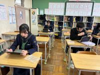 本日は、2年生が4月に行われる全国学力・学習状況調査の事前検証を行いました。教科は英語です。英語は「書くこと」とICT機器(タブレット・ヘッドセット使用)を活用した「話すこと」についての調査となります。今回は「話すこと」についての調査がスムーズに行えるように実際にICT機器を使用し、事前確認を行いました。生徒はヘッドセットから流れてくるプレ問題に対して、緊張しながらも真剣に考え解答する様子が見られました。