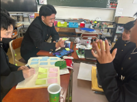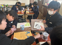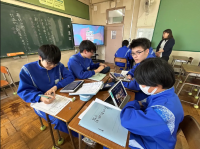 美術では、完成したマグカップのデザインについて、班ごとに発表会を行いお互いの良いところ等について意見を交わしていました。それぞれに一生懸命取り組む様子が見られました。