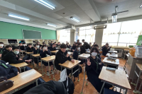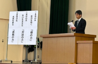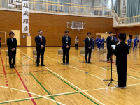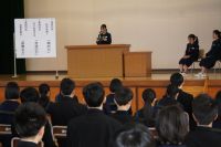 着任式、始業式が始まり、校長先生の式辞では『自分を磨く「個」の力」』『互いを支える「対話」の力」』『未来を創る「挑戦」の力」』の大切さについてお話されました。各学年代表生徒も堂々と今年一年の抱負を発表しました。新しく着任された先生方には、始業式での態度が立派だとほめていただきました。