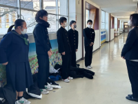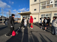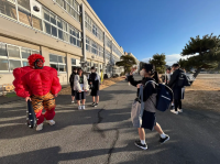 本日の登校時、生徒会企画「~赤鬼来校!?自分の心の弱さに打ち勝とう~」が行われました。節分にふさわしい衣装で挨拶運動を行い、生徒会活動をさらに活発にすることがねらいです。佐々木生徒会長が赤鬼に扮し、生徒会執行部とともに挨拶運動を盛り上げました。